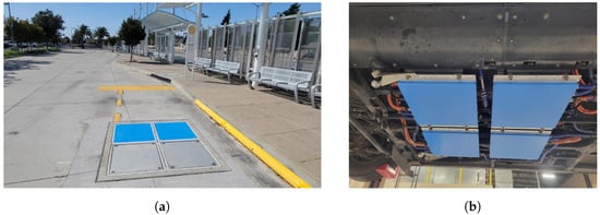 Figure 6. Static wireless charging system developed by InductEV for an electric bus: (a) ground unit (two charging pads) (reproduced with permission from InductEV Inc.). (b) Vehicle unit (four charging pads) (reproduced with permission from InductEV Inc.). - Electreon: Electreon offers both static and dynamic wireless charging technology with the static charging technology being commercially deployed since 2022. In 2022, the static charging systems were installed at city bus stops across Israel to charge 200 electric buses, following a successful pilot project at the Tel Aviv University train station in Israel [85]. By order of a second Israeli bus operator, Electreon will fit 30 more buses with their static wireless charging technology to charge at a bus depot in 2023 [86]. Also in 2023, Electreon will install two wireless charging points for an electric bus in Balingen, Germany, following a second pilot project in Karlsruhe, Germany [87].
