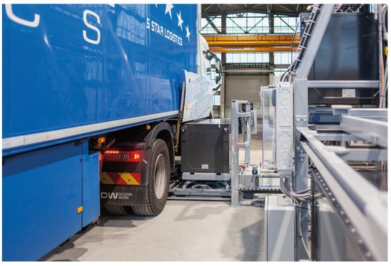 - Project eHaul: The project’s primary aim is to develop and implement an automated BSS for electric HDVs. This BSS, which is the first of its kind in Germany, will be tested by two semi-trailer trucks for several months. Besides the BSS, a business model will be designed [104]. In April 2023, the electric trucks were put into operation. In October 2023, the build-up of the BSS was completed (see Figure 7). Once all the components are synchronized, the testing will begin [105].