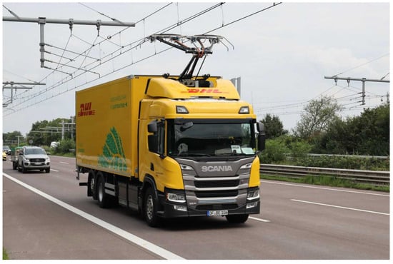- Forschungs- und Entwicklungszentrum Fachhochschule Kiel GmbH. Oberleitungs-Lkw. Available online: https://ehighway-sh.de/oberleitungs-lkw-o-lkw/ (accessed on 17 October 2023).