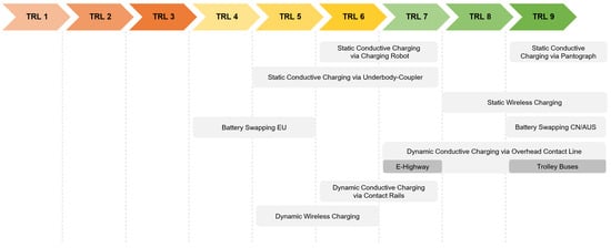 Concerning the technological readiness of the static wireless charging technology, the announced commercial deployment of the charging system developed by Electreon indicates a TRL up to 9 [85]. Additionally, the charging system developed by the company InductEV is offered as a factory option by the bus manufacturer BYD in the USA [90]. However, as acquiring a CE marking is still underway, a TRL 8–9 is suggested [81]. Owing to the high number of deployments across the USA, a minimum TRL 7 is proposed for the charging system developed by the company WAVE Charging [88]. In 2023, WiTricity announced a collaboration with a Chinese manufacturer of autonomous buses. As the company’s charging system has previously only been installed in passenger vehicles, a TRL 5 is suggested [91]. Although there is a strong deviation between the TRLs of the different manufacturers, a higher TRL for static wireless charging can be determined by the commercial availability of the systems of some manufacturers. Overall, a TRL between 8 and 9 is identified. As mentioned above, a high TRL does not exclude further development of the charging technology in order to address potential challenges.