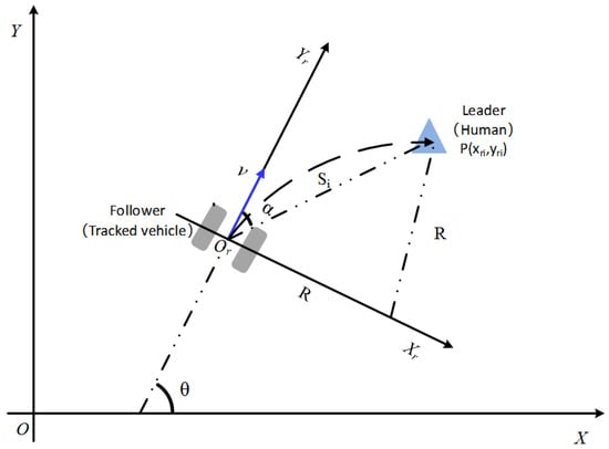 The coordinates of the leader in the geodetic coordinate system vary arbitrarily based on the basic characteristics of leader motion. The unmanned tracked vehicle needs to obtain the relative coordinate position X r i and Y r i of the leader in O r X r Y r through its leader detection unit and then reasonably control its speed and curvature through the motion control unit, so that the unmanned tracked vehicle can consistently follow the leader. During the following, the head of the vehicle is oriented toward the leader as far as possible, and the position of the vehicle closely follows the coordinates in the geodetic coordinate system as accurately as possible, ensuring a reasonable distance between the vehicle and the leader [33]. During the following, it is required that X r approaches 0 and Y r remains within a reasonable range based on the leader’s speed. When the leader abruptly stops, the tracked vehicle must promptly respond to ensure a safe braking distance. The specific tracking targets are as follows: