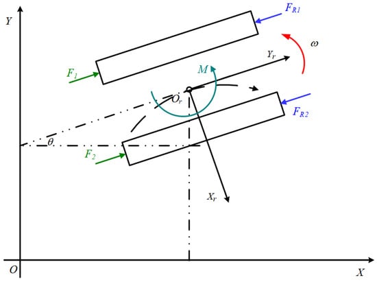 As mentioned above, the geodetic coordinate system is denoted as O X Y , and the follower coordinate system of the tracked vehicle is denoted as O r X r Y r . The resultant forces acting on the tracked vehicle are shown in Figure 2.