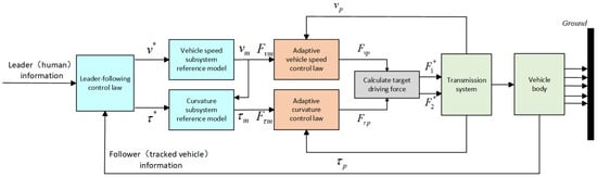 The adaptive control strategy devised in this study involves the following steps: First, the control signals from the leader detection unit are analyzed to extract the target vehicle speed ( v ) and the target steering curvature ( τ ). Then, both of them are subject to the closed-loop control in comparison with the actual vehicle speed (v) and steering curvature ( τ ) so as to enable adaptive adjustment to the reasonable target driving force F i .