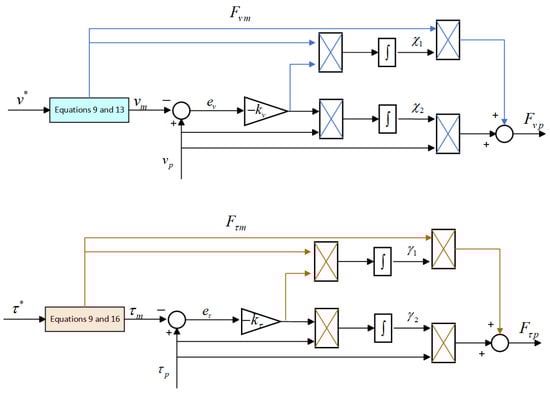 The purpose of designing the adaptive control law is to determine the actual inputs F v p and F τ p required for controlling the adaptive solving system based on F v , F τ , v m , and τ m and the feedback of the actual motor speed, ultimately deriving the motor torque.