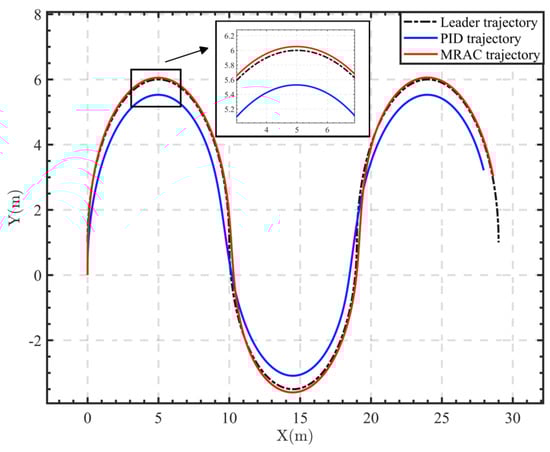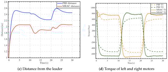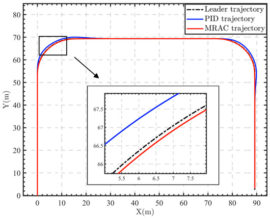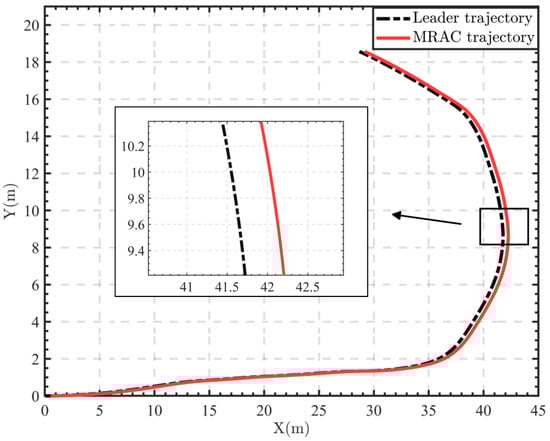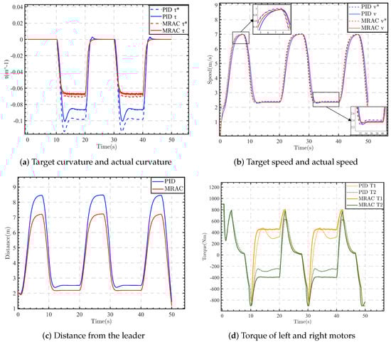 Figure 6 illustrates the leader-following effect of the unmanned tracked vehicle in condition 1, and Figure 7 compares the performance of the two control methods in condition 1. Compared to the PID control method, the maximum deviation between the MRAC vehicle trajectory and the leader trajectory is reduced by 6%, there is a maximum curvature error reduction of 11% and a maximum speed error reduction of 5%, and the maximum following distance is reduced by 12%. Moreover, MRAC can fully exploit the performance of the vehicle’s dual motor. MRAC performs well in straight-line motion and closely follows the leader in the steering phases, demonstrating better completion of the leader-following task than the PID control method.