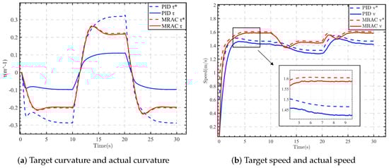 Figure 8 illustrates the leader-following effect of the unmanned tracked vehicle in simulation condition 2, and Figure 9 compares the performance of the two control methods in condition 2. In this case, the maximum deviation between the MRAC vehicle trajectory and the leader trajectory is reduced by 6.6%, there is a maximum curvature error reduction of 47% and a maximum speed error reduction of 3.5%, and the maximum following distance is reduced by 16%. Because this scenario involves low-speed control, the speed errors for both control methods are relatively small. It can be observed that the MRAC decoupling control method significantly improves the steering performance of the vehicle, even in extreme steering conditions where the PID curvature control deviation is significant, ensuring perfect following of the target curvature.