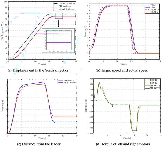 Figure 10 compares the performance of the two control methods in test condition 3. Due to the condition involving straight-line driving and emergency braking, only the displacement in the Y-axis direction needs to be considered. During regular driving phases, both control methods can effectively follow the leader’s movements. In the emergency braking phase, the MRAC control method achieves a reduction of 22% in the braking distance, enabling it to stop at a greater distance from the leader, ensuring the safety of the leader (human). Simultaneously, during the braking process, energy recovery can be achieved through the motor, reducing the vehicle’s energy consumption.