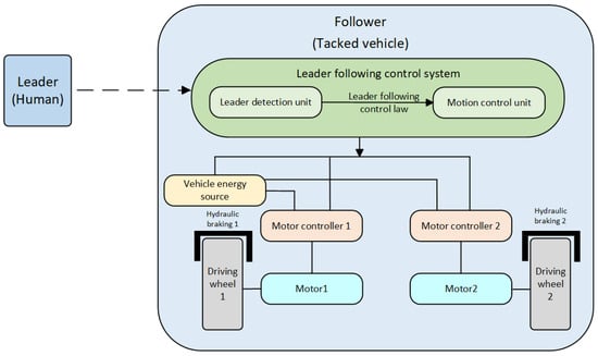 The existing relative research can be broadly categorized into two types: one is the study of following performance and maneuverability of wheeled vehicles or unmanned robots, and the other is the study of motion control for unmanned tracked vehicles. Dasgupta et al. focused on the platooning of Heavy Duty Vehicles (HDVs), utilizing a PID controller to enhance tracking performance through strategies for platoon merging and splitting [19]. Akopov et al. introduced a novel parallel real-coded genetic algorithm that integrates a fuzzy transportation system model to improve the lane-changing maneuverability of unmanned ground vehicles [20]. Liang et al. developed a distributed control architecture for connected and automated vehicles (CAVs), where the upper layer addresses vehicle-cruising and vehicle-following maneuvers, and the lower layer handles detailed motion control [21]. Cosgun et al. introduced a method enabling a mobile robot to autonomously follow a person, which involves a task-dependent goal function that delineates the desirable areas for the robot in relation to the person [22]. Satake et al. used the SIFT feature for the identification of a person and created a distance-dependent appearance model to follow a specific person [23]. While the previous research offers insights into the study of the leader-following task, there is a notable lack of studies dedicated to the tracked vehicles.