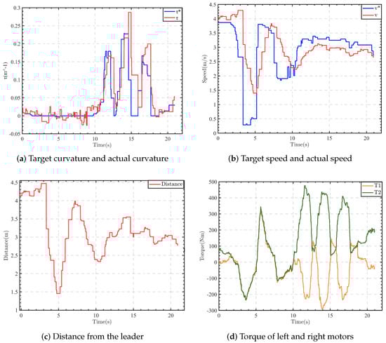 Figure 14 illustrates the leader-following effect of the unmanned tracked vehicle under actual vehicle experiment conditions. In the experiment, the maximum deviation between the MRAC vehicle trajectory and the leader trajectory is 0.48 m, and the maximum curvature error is 0.05 m−1. It can be observed that during straight-line movement, the following distance is positively correlated with the actual speed. During large curvature turning, the following distance is extended by approximately 0.5 m but remains within a controllable range. Therefore, in real-world scenarios, the control strategy utilized in this study can effectively control the vehicle, accomplishing the leader-following task excellently.