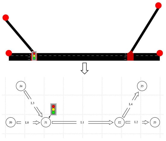 Figure 3 illustrates the road model of an urban expressway ramp entrance and exit selected in this paper. The design of this road network model takes into full consideration the needs and characteristics of urban ramps. L1 is the main urban traffic artery, which is set up as three lanes and a traffic signal is set up at J1. The left end of the ramp, L3, is the entrance, where the vehicle can enter the main artery from the periphery of the city. The right ramp, designated L4, is intended for vehicles originating from the main road and destined for the city exit.