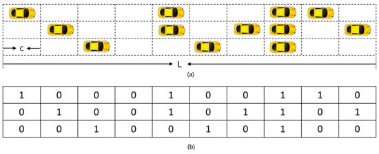 Definition of state space. (a) Actual position of the car on the road; (b) State matrix of the lane.
