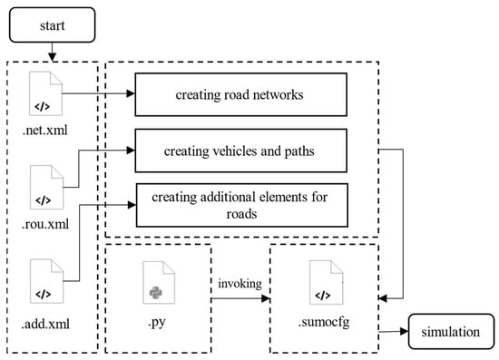 Figure 5 illustrates the general simulation flow for SUMO. The .net.xml file and the .rou.xml file are employed initially, representing the road network and the fundamental vehicles, respectively. If you want to make the simulation more complex, such as pedestrians, different types of vehicles, car parks, etc., you can define the desired elements in the .add.xml file. If you want to automate the simulation using intelligent control algorithms, you need to define .py files to integrate with the API and then call all the above files to the .sumocfg file to run the simulation. The simulation system’s default models consist of the lane-changing and car-following models regularly deployed in SUMO simulations. To closely emulate realistic traffic flow, we base our traffic flow approximation on the Poisson distribution, whereby random car creations are spread out over the road network and introduced simultaneously at specific intervals. For more details on the specific setup parameters, consult Table 1.
