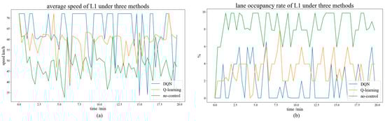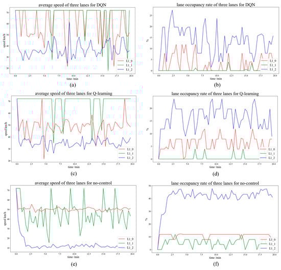 The average speed and lane occupancy rate for each lane on L1 are also compared to validate the performance of the proposed model fully, as shown in Figure 7. In terms of the average speed, the first lane (red) has the highest average speed for the DQN-control model, which is mostly above 50 km/h, while the average speed for the no-control model is concentrated around 50 km/h. In the second lane (green), the average speeds for the control models of both reinforcement learning methods are higher than that of the no-control model, and in the DQN control third lane (blue), the average speed peaked several times (70 km/h), while the average speed of the Q-learning control model ranged from 30 to 40 km/h, and that of the no-control model was concentrated around 10 km/h. In summary, the DQN control model outperforms both the Q-learning model and the no-control model in terms of average vehicle speed.