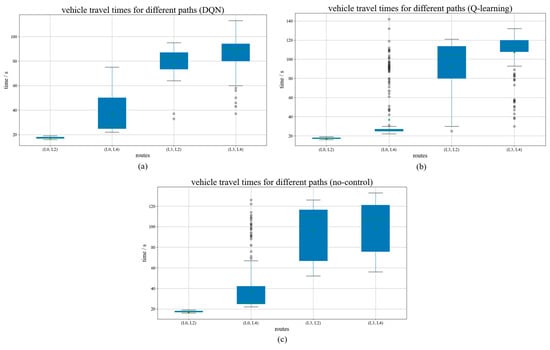 Vehicle travel times for different paths. (a) DQN; (b) Q-learning; (c) no control.