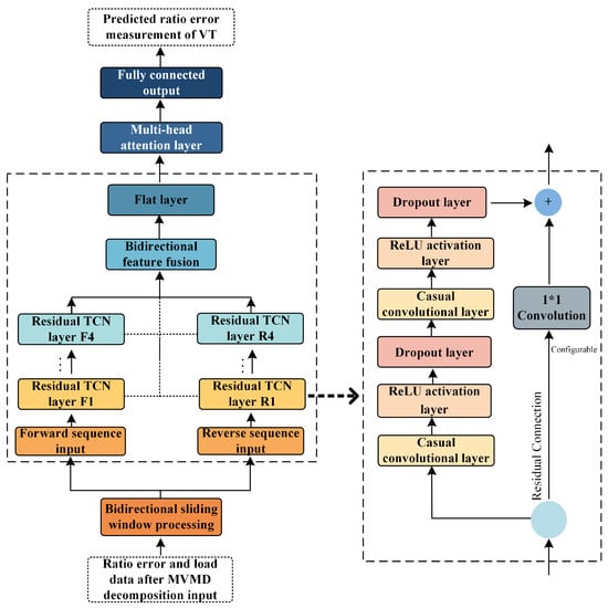 The accuracy of voltage transformer (VT) measurements is imperative for the security and reliability of power systems and the equitability of energy transactions. The integration of a substantial number of electric vehicles (EVs) and their charging infrastructures into the grid poses new challenges for VT measurement fidelity, including voltage instabilities and harmonic disruptions. This paper introduces an innovative transformer measurement error prediction model that synthesizes Multivariate Variational Mode Decomposition (MVMD) with a deep learning framework integrating Bidirectional Temporal Convolutional Network and Multi-Head Attention mechanism (BiTCN-MHA). The paper is aimed at enhancing VT measurement accuracy under fluctuating load conditions. Initially, the optimization of parameter selection within the MVMD algorithm enhances the accuracy and interpretability of bi-channel signal decomposition. Subsequently, the model applies the Spearman rank correlation coefficient to extract dominant modal components from both the decomposed load and original ratio error sequences to form the basis for input signal channels in the BiTCN-MHA model. By superimposing predictive components, an effective prediction of future VT measurement error trends can be achieved. This comprehensive approach, accounting for input load correlations and temporal dynamics, facilitates robust predictions of future VT measurement error trends. Computational example analysis of empirical operational VT data shows that, compared to before decomposition, the proposed method reduces the Root-Mean-Square Error (RMSE) by 17.9% and the Mean Absolute Error (MAE) by 23.2%, confirming the method’s robustness and superiority in accurately forecasting VT measurement error trends.