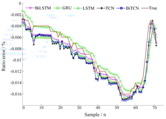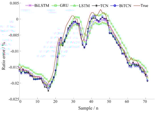 To verify model improvements through backtesting, original data are utilized as input, against which six benchmark models are compared: GRU [27], LSTM [28], BiLSTM [29], TCN [30], and the enhanced TCN, namely the bidirectional BiTCN model. For consistent lateral comparison, a uniform learning rate of 0.0025 is set, along with a batch size of 256 and a step size of 24. The L2 regularization parameter for all models is set to 5 . The hidden layers for GRU, LSTM, and BiLSTM models are configured to 100, while both TCN and BiTCN have four layers, with a dropout rate of 0.1. Comparative assessments of prediction performance are illustrated in Table 1. Randomly select two consecutive 72-points for display in Figure 4 and Figure 5.