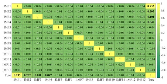 As demonstrated in the figure above, adaptive decomposition effectively segments the original ratio error and load sequences into distinct subcomponents. The parameters (K, ) are configured to round towards zero, where the optimal decomposition values are (13, 18,271). The decomposed IMF components are then screened using the Spearman rank correlation coefficient. Only those subcomponents that exhibit strong correlations with the original sequence are retained. The results of this correlation analysis are presented in Figure 7.