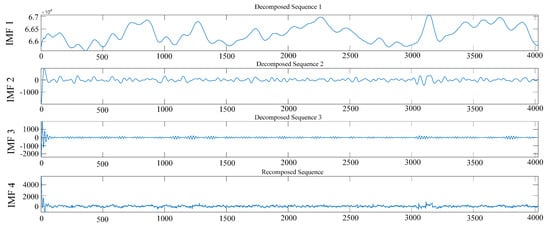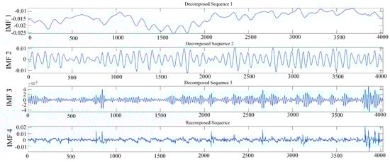 Based on the correlation coefficients calculated in Figure 7, a threshold value Q of 0.1 is set. Subcomponents with correlation coefficients greater than Q are retained as relevant components for building the prediction model. Subcomponents with values less than Q, IMF3 to IMF13, are combined to form a high-frequency component. The residual components from the decomposition are also added to this combination, resulting in a new reconstructed component referred to as IMF4. The reconstructed load and ratio error components are shown in Figure 8 and Figure 9.
