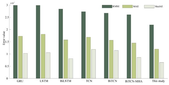 The results in Table 2 indicate that the method proposed in this study outperforms the standard BiTCN and the enhanced BiTCN-MHA model in various evaluation metrics. Specifically, improvements of 17.9%, 23.2%, and 43.1% in RMSE, MAE, and MedAE were noted compared to the standard BiTCN, and 15.9%, 17.1%, and 23.9% improvements compared to the BiTCN-MHA. This method not only shows superior performance in overall error management compared to BiTCN and BiTCN-MHA but also demonstrates higher robustness and effectiveness in managing median errors. The value of 0.6507 × is significantly lower than 1.143 × for BiTCN and 0.856 × for BiTCN-MHA, clearly improving on the limitations of previous BiTCN models. This indicates that the proposed method not only minimizes overall error management but also has significant advantages in handling outliers and extreme data points. From Figure 10, it is also observed that MVMD-BiTCN-MHA not only shows more precise trend following in tracking real values but also exhibits better adaptability and prediction accuracy when dealing with extreme data points.