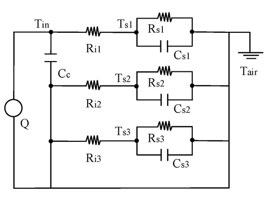 For the convenience of deriving the equivalent thermal circuit model, the relative temperatures of each part of the battery are defined in Equation (2). The positions of , , and correspond to , , and , respectively.