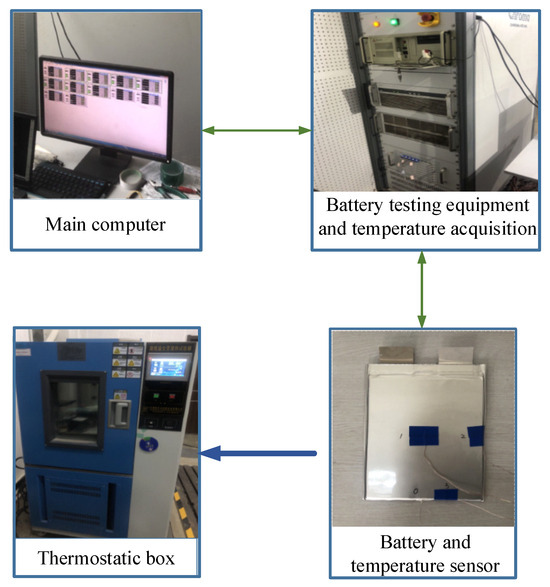 The parameters of the thermal model are identified through experimental data, and Figure 2 shows the test platform. Four thermocouples are arranged at the inner center, maximum outer surface center, side center, and bottom center of the battery to measure four temperature points . During the experiment, the battery is placed in a thermostatic box, which is used to adjust the external environmental temperature and conduct experiments at different ambient temperatures. The charging and discharging equipment is connected to the battery, and the charging and discharging experiment is conducted through the charging and discharging regulations input by the main computer. The current, voltage, and temperature data during the process are collected through the charging and discharging equipment and temperature data acquisition and input into the main computer for recording. Since the sampling frequency of temperature is 1 s in engineering practice [19], the sampling frequency of all tests in this paper is 1 s.