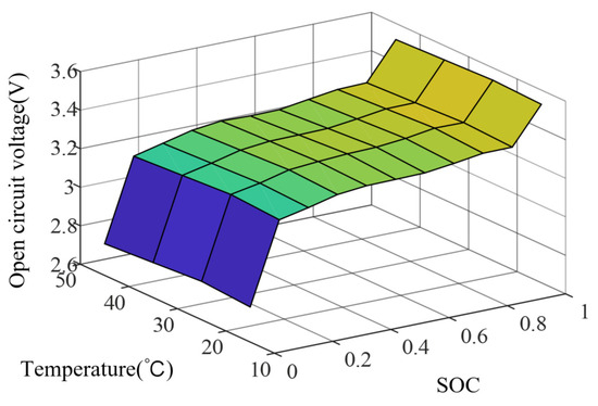 The terminal voltage of the battery recorded during the experiment is considered as the open circuit voltage at the current temperature and SOC. All open circuit voltage values were recorded and displayed in the form of a three-dimensional graph, as shown in Figure 3. In the thermal model calculation process, the open circuit voltage is obtained by looking up the SOC and internal temperature table, and the reversible heat is calculated according to Equation (1).