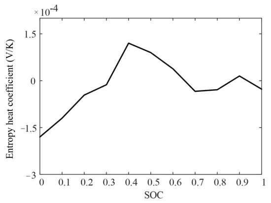 The entropy heat coefficient of the battery refers to the derivative of the open circuit voltage with respect to temperature. During the low-rate charging and discharging process, irreversible heat is the main source of battery heat generation. The purpose of this section’s entropy heat coefficient identification experiment is to obtain the entropy heat coefficient in the irreversible heat calculation formula in Equation (1), whose value is a function uniquely related to the SOC [20]. The battery was set to discharge at a rate of 1 C at an ambient temperature of 25 °C, the voltage variation with temperature was recorded at different SOCs, and the entropy heat coefficient was obtained, as shown in Figure 4.