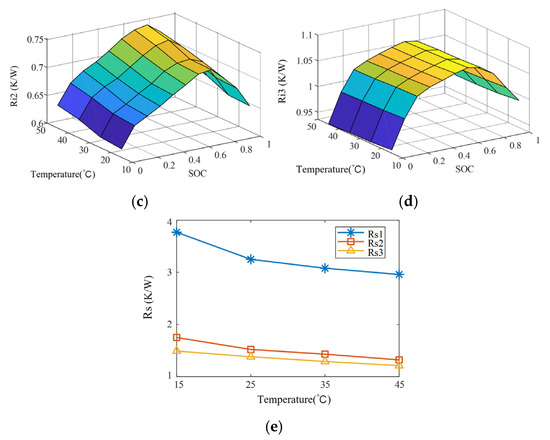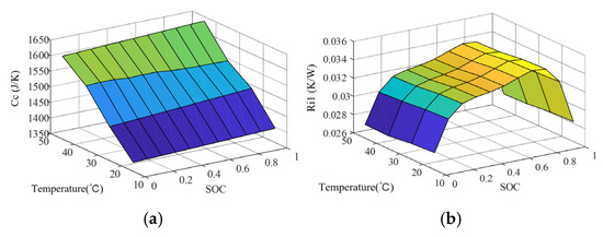 The symbols in the coefficient matrix can be calculated from Equation (9). Meanwhile, the coefficients in Equation (8) can be fitted using the least squares method. Furthermore, the thermal model parameters of the battery can be calculated by the relationship between the coefficients in Equation (9) and the thermal model parameters. The equivalent internal heat capacity and equivalent internal thermal resistance are three-dimensional relationships between the SOC and temperature. The equivalent external thermal resistance represents the thermal resistance between the battery surface and the environment, which has a minor relationship with the battery SOC and is related to the ambient temperature. It is identified as a temperature-dependent function. During the calculation process of the thermal model, the above parameters are obtained by looking up the table based on the actual SOC and the predicted internal temperature of the battery.