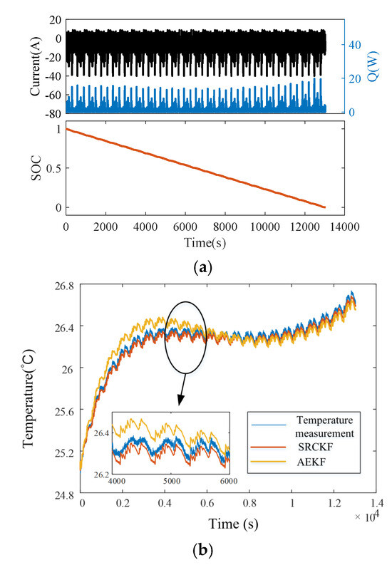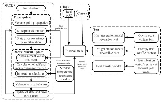 The SRCKF outputs the predicted internal temperature value and inputs it into the thermal model to update the thermal model parameters. The algorithm process is shown in Figure 6. The experiment can provide a parameter basis for the thermal model. The inputs of the thermal model are the predicted values of current, the actual SOC, and the predicted internal temperature. The outputs of the thermal model are the calculated values of the heat generation rate and three relative surface temperatures. The output heat generation rate is input into the SRCKF for prior estimation calculation of state variables. The relative surface temperature calculated by the thermal model is input into the measurement update for prediction of the measurement values, that is, the predicted values of the three relative surface temperatures. Further information is obtained by the difference between the measured and predicted relative surface temperature values. Finally, by updating the state variables and error covariance matrix through the Kalman gain, the predicted internal temperature values are updated, and the thermal model parameters are updated by inputting them into the thermal model.