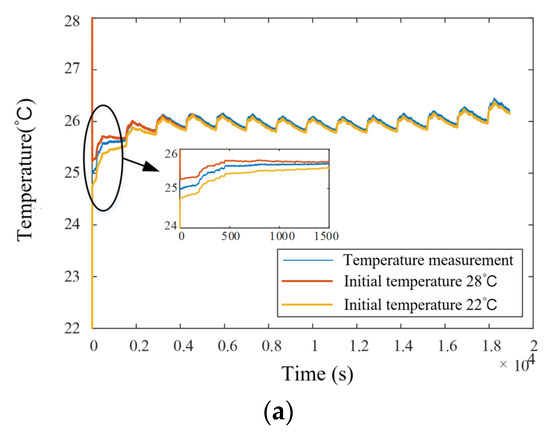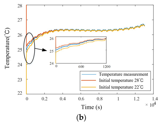 In practical applications, temperature sensors cannot be installed inside a battery, so the initial value of the internal temperature is difficult to obtain. If the initial value error is ignored, there will be an offset in the internal temperature calculation results, which will affect the accuracy of temperature estimation. One important role of the SRCKF algorithm is that it solves the poor accuracy of internal temperature estimation caused by initial value errors [14]. This paper verifies the robustness of the estimation method by changing the initial value of internal temperature. The experimental data used are two dynamic operating conditions of batteries, FUDS and US06, at an ambient temperature of 25 °C. Different initial values of the internal temperature were set at 28 °C and 22 °C to verify the robustness of the estimation method in the presence of initial errors. The results are shown in Figure 9. Under different operating conditions, when the internal temperature has an initial error, the estimation results can be quickly adjusted back and can be adjusted back to the true value within 1200 s under the two operating conditions. The error of the thermal parameters in the temperature range of 22 °C to 25 °C is slightly higher than that in the temperature range of 25 °C to 28 °C, resulting in a slower internal temperature correction speed when the initial temperature is 22 °C under the two operating conditions. As the experiments continue, the two internal temperature curves with different initial values gradually approach, until the middle and later stages of the experiment, they almost completely overlap. This indicates that the SRCKF algorithm can solve the problem of initial value errors and can ensure the robustness of the result.
