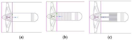The different cooling structures of motors: (a) the motor casing of model 1; (b) the motor casing of model 2; (c) the motor casing of model 3.