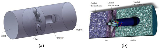 The simulation model shown in Figure 2a includes an inlet, outlet, duct, rotating fan blade, motor, and controller. The fan blade region is set as the rotating domain with a speed of 10,000 rpm, and the blades and the outer walls of the motor are set as non-slip walls. The motor rotates the blades to simulate the initial takeoff operation of the ducted fan. The boundary condition of the outlet is set as outflow; the fluid is an ideal compressible gas. Mesh division is performed using ANSYS Fluentmeshing 2021R1 software, with fine grid refinements at the wall surfaces, as shown in Figure 2b.