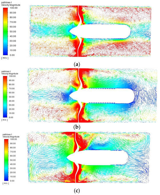 The computed results are illustrated in Figure 3. Comparing the airflow passing through the outer wall of the motor, the flow fields of model 1 and model 2 appear more symmetrical. There is a velocity loss at the fins of model 3, while the velocity loss at the smooth walls between the fins is noticeably reduced. The maximum velocity near the outer wall of the motor is observed with model 1.