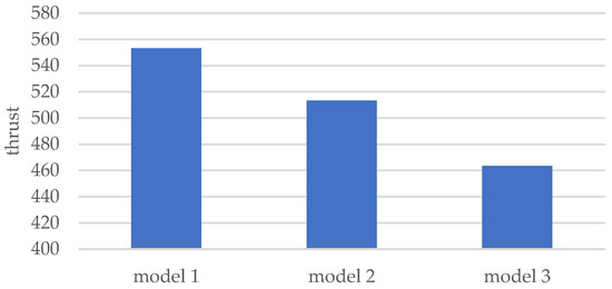 The presence of fins has a certain impact on the overall performance of the ducted fan. The axial thrusts are calculated as follows: axial thrusts of models 1–3 are represented as 553.37 N, 513.28, and 492.87 N, consecutively.