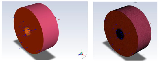 The key challenge in solving the heat dissipation problem is determining the convective heat transfer coefficient under air cooling conditions. The first step is to calculate the convective heat transfer coefficient on the outer surface of the motor. The calculation model and grids are shown in Figure 5. The simplified model assumes that heat only dissipates from the motor housing, the heat flux on the outer surface of the motor housing is uniformly distributed, and external air flows axially and circumferentially, neglecting gravity. The boundary conditions are set as follows: an inlet flow velocity of 8 m/s (provided by the experimental setup) and the heat source is 470 W.