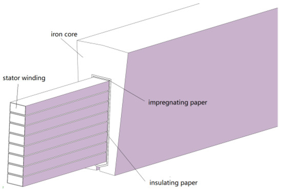 Next, the internal temperature field of the motor stator is calculated. To optimize computational resources, a full model of a single stator unit within the motor is developed, encompassing the housing, iron core, windings, impregnating varnish, and insulation paper for comparative thermal evaluation inside the motor, as shown in Figure 6.