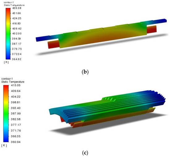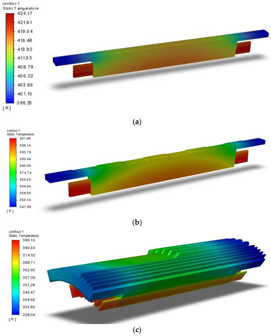 The simulation results of motors: (a) the temperature of model 1; (b) the temperature of model 2; (c) the temperature of model 3.