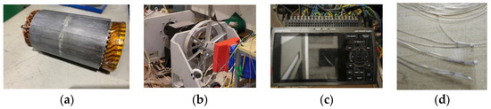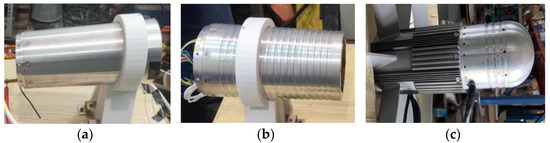 Three motors with different heat dissipation designs were built and tested to verify the design’s effectiveness. The motor core component and experimental platform can be observed in Figure 8a,b. The experimental platform comprises the tested motor, controller, cooling system, temperature data collector, and other essential components. The temperature data acquisition system model GL820 is shown in Figure 8c. The thermal resistance for temperature measurement is buried at the end of the winding. The thermal resistance is Pt1000, shown in Figure 8d. The three prototypes designed are shown in Figure 9. To facilitate the airflow testing, a fan was used in place of the ducted fan, and the airspeed was measured using an anemometer. This experiment serves to test the performance of different methods and validate the accuracy of the simulation methods discussed earlier.