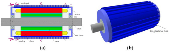 Chen solved the issue of overheating in a ducted fan motor during operation [21]. An electromagnetic finite element model of the motor was first established using the Maxwell 2D software to calculate losses. The losses were coupled as heat sources into the ANSYS Workbench 2021R1 software for a magnetic–thermal coupling analysis. To alleviate the temperature rise in the motor, the proposition of attaching heat sinks to the motor casing was made, with an analysis conducted on three different shapes of heat sinks—rectangular, trapezoidal arc, and triangular. Jin introduces a motor design model based on the fan hub-to-tip ratio, which demonstrates the significant potential of the thermal coupling effect between fan aerodynamic design and motor cooling design in enhancing motor power density in electric propulsion systems [22]. A smaller hub-to-tip ratio is preferred, ensuring power and cooling balance.