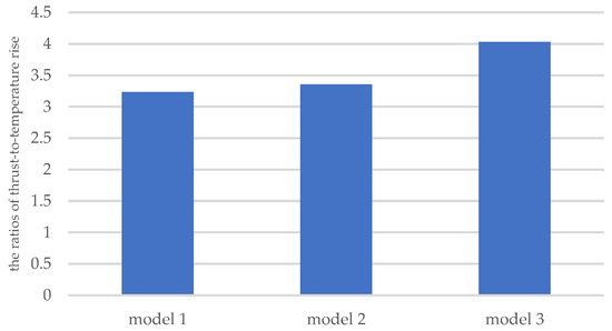 The ratios of thrust-to-temperature rise in the ducted fan are shown in Figure 14. Model 3 with longitudinal fins has a higher thrust-to-temperature rise ratio, allowing for a higher power output within the same motor winding temperature limit in practical use, thereby enhancing the overall performance of the fan motor system. Analyzing the optimization and improvement of motor cooling reveals its beneficial impact on enhancing the overall performance of fan motors. Thus, in the later stages of design, it is advisable to prioritize increasing the thrust-to-temperature rise ratio of the fan motor while meeting aerodynamic performance requirements. This approach can lead to better electrical motor performance and higher output power.