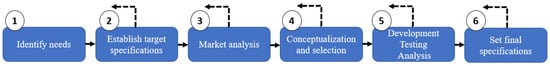 The general conceptual product development process [33] is adopted here (see Figure 1) and includes the following phases therein presented. It is important to note that there is a correlation between this methodology and others adopted in the development of naval military projects [34,35], in which all use a sequential and iterative approach to obtain the most efficient and effective final product.