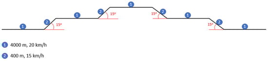 Furthermore, the mission profile illustrated in Figure 2, of interest to the Portuguese Navy, is defined as follows: (i) a first 4000 m plane segment followed by a 15° positive slope; (ii) a second 4000 m plane segment followed by a 15° positive slope; (iii) a third 4000 m plane segment followed by a 15° negative slope; (iv) a fourth 4000 m plane segment followed by a 15° negative slope; and (v) a fifth 4000 m plane segment.