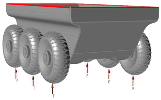 A load that simulates the total weight of the vehicle and its payload is equally distributed and applied in the upward direction on the bottom of all six wheels, and a displacement constrain is applied in all directions at the top edges of the hull (see Figure 3).