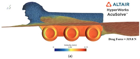 Next, using Altair® HyperWorksTM V2023.0 with the AcuSolveTM solver V2023.0, the 3D pressure and velocity distributions, as well as the drag force of the vehicle, were estimated (see Figure 4) using the methodology described in Section 2.4.3.