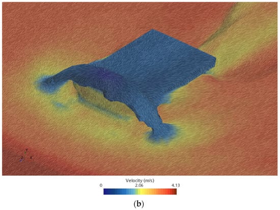 Surface pressure and water–air interface with velocity results: (a) side view; (b) perspective view.