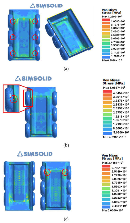 Figure 5a through Figure 5c illustrate the Von Misses stress distribution results when considering the following: Figure 5a, a total applied static load of 500 N; Figure 5b, the critical static load; and Figure 5c, a total applied dynamic step load of 500 N. In Figure 5a, it is possible to observe that the points where the highest stresses are located are some edges and vertices of the hull structure and the shafts that connect the wheels to the hull [41]. However, the maximum stress to which the structure is subjected is approximately 12.6 MPa, located in the shafts. Given that the yield stress of the shaft material is 503 MPa, it is verified that the material can withstand the imposed static load, as in [42].
