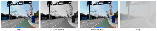 To avoid traffic accidents that cause harm to pedestrians, especially children, the categories ‘w55’ and ‘w57’ in the TT100K dataset were chosen in this experiment. Furthermore, two types of traffic signs around schools in Tianjin were collected in 2023, and 1000 images were selected from it. To fulfill the complex environments in pedestrian TSDR, the approach of enhancing corruption [26], such as motion blur, Gaussian noise, and fog, was chosen to enhance the TT1001K dataset. The additional data collection process and data augmentation are shown in Figure 2.