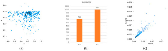 Volume of TSDR label data and TSDR label distribution: (a) coordinates of labeled box’s center point; (b) the number of ‘w55’ and ‘w57’; and (c) labeled box’s width and height distribution.