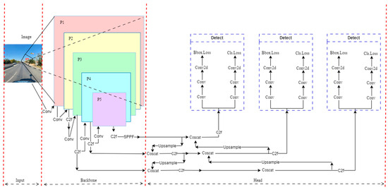 The head is responsible for generating the final prediction through effectively integrating and fusing feature maps from different levels, promoting functional integration and fusion at different scales and levels of abstraction. Also, DFL (distribution focal loss) is used to extract more detailed information. This step involves the application of non-maximum suppression (NMS) techniques to filter out redundant outcomes, thereby preserving dependable and precise prediction results. This model preprocesses the received image in the input layer by scaling and adjusting the color tone. Afterwards, four images were randomly merged through data augmentation and connected to one image for training data, thereby reducing data processing time. Therefore, there is no need to consider the impact of data distortion and different environments in the backbone layer and the head layer.