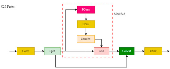 - The C2f Faster module is constructed using a PConv (a novel partial convolution that extracts spatial features more efficiently by reducing redundant computation and memory access simultaneously) layer followed by Conv 1 × 1 layers, which can reduce the amount of computation and parameters.